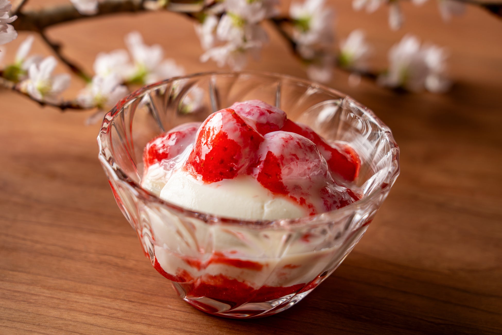 単品でも十分に美味しい杏仁豆腐を、鮮やかな紅色と甘味、バランスの良い酸味が特長の”紅ぽっぺ”を 使ったいちご練乳仕立てにしました。