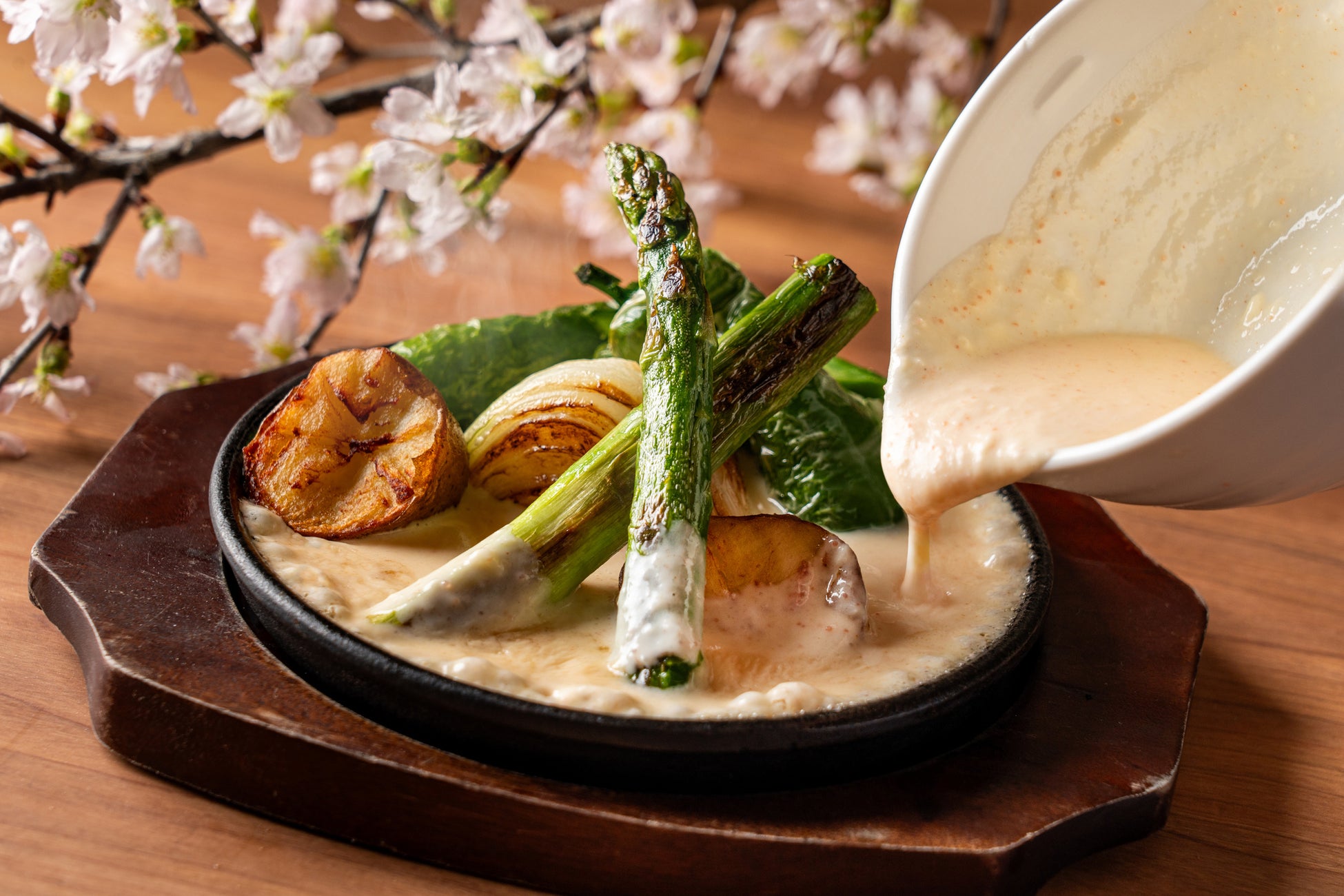 新玉ねぎ、新じゃが、アスパラガス、甘長唐辛子など旬を迎えた春野菜のグリルを春らしい色合いの明太チーズをまとった卓上仕上げのチーズフォンデュ。