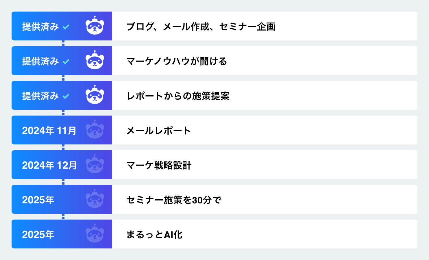 今後、マーケティング支援AI「AIBOW」にはさらに多彩な機能が続々と追加される予定です。近日中には、簡単な入力をするだけでマーケティング戦略設計ができる機能を搭載予定です。また、2025年には複数の機能を横断して施策を自動設定できるようにするなど、オールインワンの特徴を活かした新たな機能を順次リリースしてまいります。