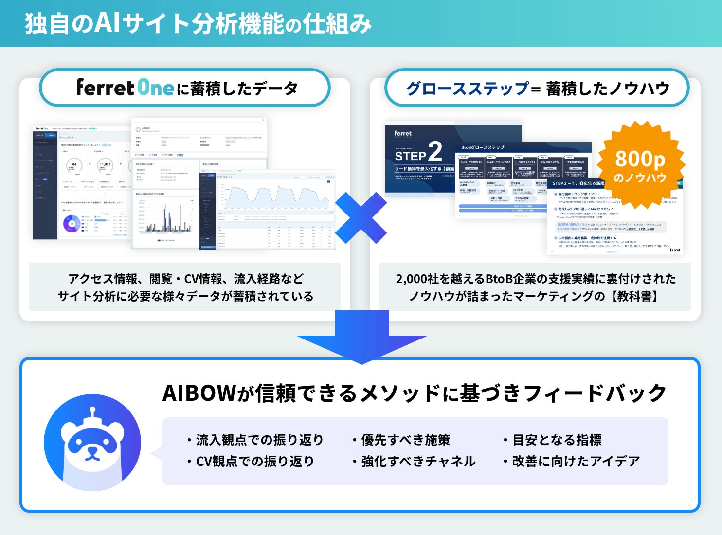 今回の新機能では、Webサイトに蓄積されたデータと『ferret One』が持つノウハウを掛け合わせて、AIが自動で結果の評価や施策の提案をしてくれます。
