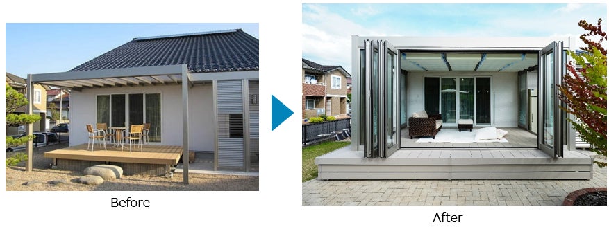 当初、お客様は今のテラスを撤去しガーデンルームを設置する相談に来られたのですが、まだ充分に使える状態だったので、プラスリフォームをご提案。「ソラリア テラス囲い」で正面開口部は折りたたみ戸、セピアグレイの「リウッドデッキ 200」の組合せのドレスアップリフォーム提案を気に入っていただきました。正面の折りたたみ戸の寸法が足りない部分をFIXの壁を作って調整するなど、オーダーメイドな納めとなりましたが、その分仕上がりも大変ご満足いただくことができました。
