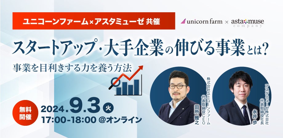アスタミューゼ株式会社(本社:東京都千代田区、代表取締役社長 永井歩)は、2024年9月3日(火)17:00-18:00に、株式会社ユニコーンファーム(本社:東京都渋谷区、代表取締役CEO:田所 雅之)と共同で、新規事業や研究開発担当者に向けた無料ウェビナー「スタートアップ・大手企業の伸びる事業とは? 〜事業を目利きする力を養う方法〜」を開催いたします。