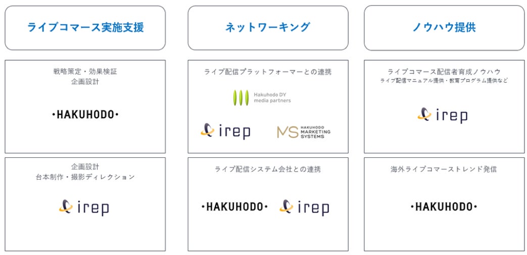 博報堂が持つ事業設計ノウハウ・企画設計力と、アイレップが持つライブコマースの企画設計力及び実践知が掛け合わさることで、配信で完結しない「事業課題を解決するためのライブコマース」を実現することが可能になります。配信タイミングでの売上最大化だけでなく、配信視聴者へのリテンション戦略や配信動画の広告への利活用・視聴者コメントのマーケティング活動への活用など、「ライブコマースをどう事業成長につなげるか」という視点で統合的なサポートを行います。既に協業実績のある両社が本格的なパートナーシップを発揮し、より一層得意先ニーズへの対応力を強化してまいります。