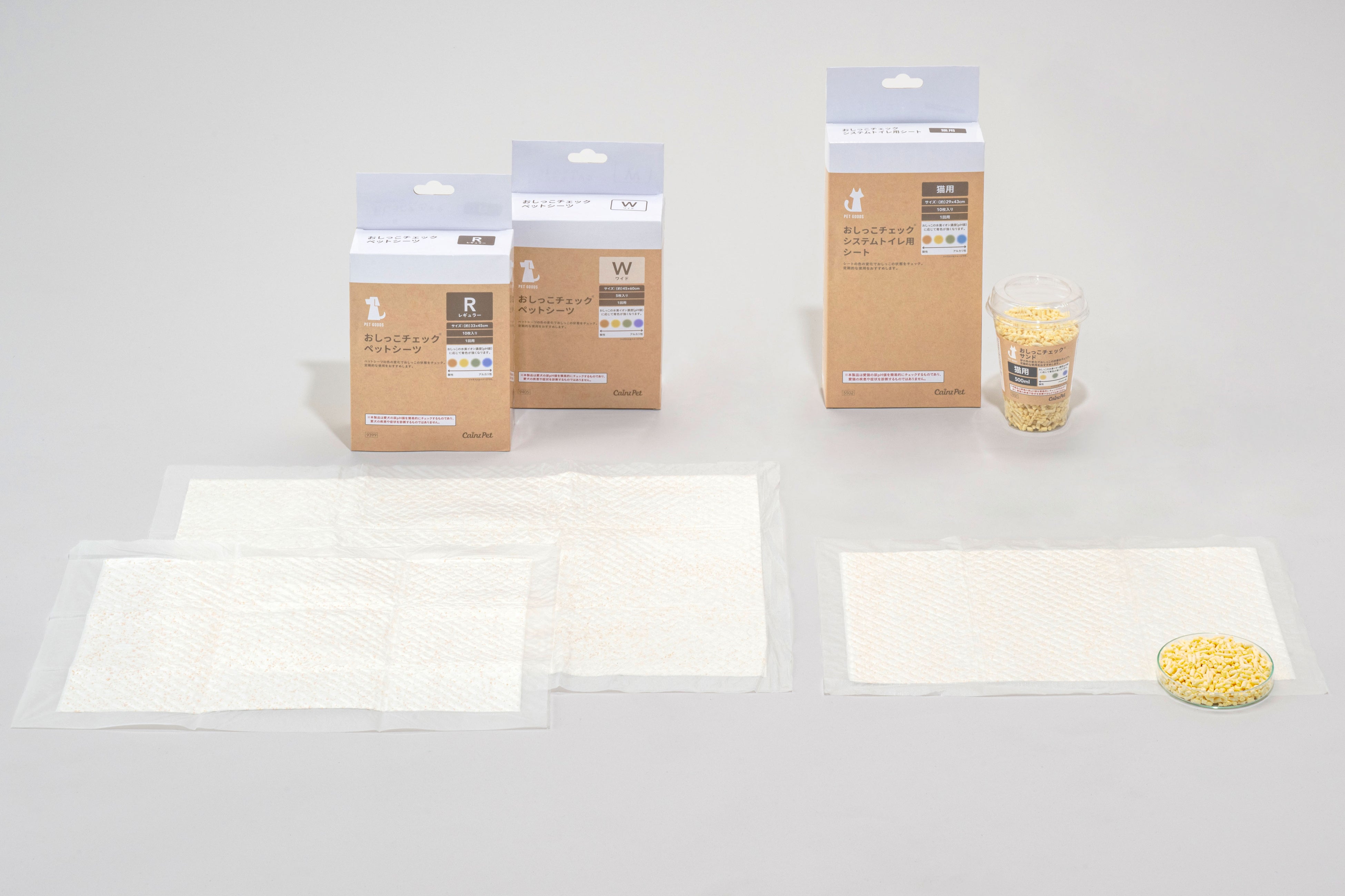 ペットのおしっこのpH値でシーツやサンドの色が変化することで、愛犬・愛猫の健康状態を視覚的にチェックできる商品です。ペットシーツ、システムトイレ用シート、サンドのラインアップで、普段使っている環境に合わせてお選びいただけます。いつものシーツやサンドを定期的に置き換えるだけなので、無理なく健康管理の習慣化が可能です。