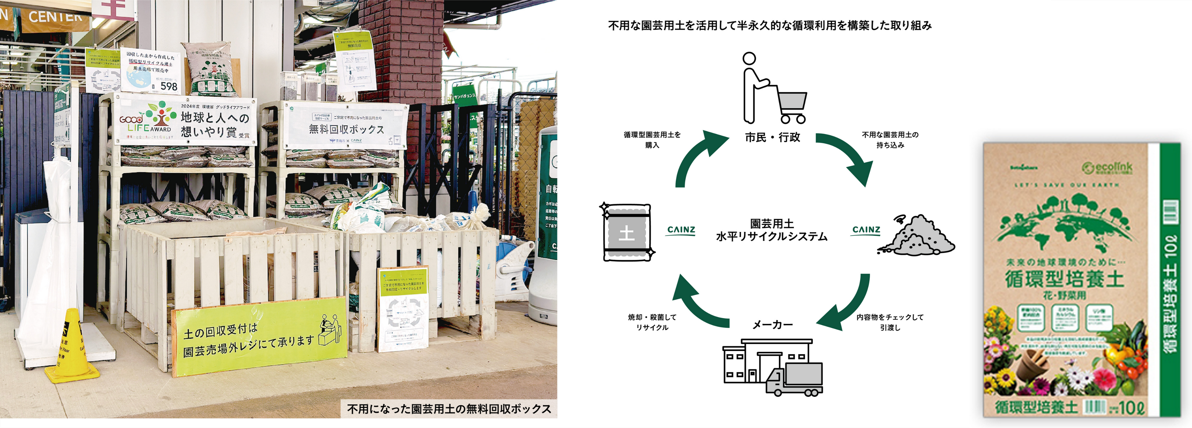 多くの自治体で課題となっている園芸用土の処理に着目し、自治体・園芸用土メーカー・カインズが連携して構築したリサイクルシステムです。地域住民が家庭で不用になった園芸用土を店舗に持ち込み、店舗で一時保管します。その後、連携する用土メーカーが回収し、焼成炉で高温処理・殺菌を行った上で他の原料と混ぜ、新しい用土として生まれ変わります。再生された用土は「循環型培養土」として、再びカインズの店舗で商品として販売しています。カインズの店舗をハブに、市民・自治体・企業が連携して地域の課題を解決する取り組みで、2025年10月時点で7店舗に展開しています。