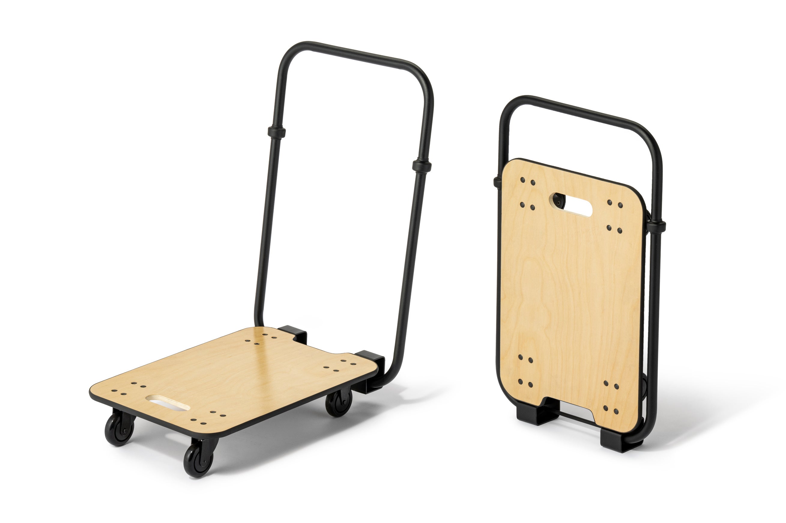 家庭用の木製台車です。近年は災害対策として水などを備蓄する家庭が増え、重い物を一度に運ぶ機会も増えています。こうしたニーズも踏まえ、「日常生活の中でスマートに使える台車」をコンセプトに開発しました。荷台面のフルフラット化と自立収納を可能にしたデザインで、運搬がラクに行えるだけでなく、収納時にも空間に調和する台車です。