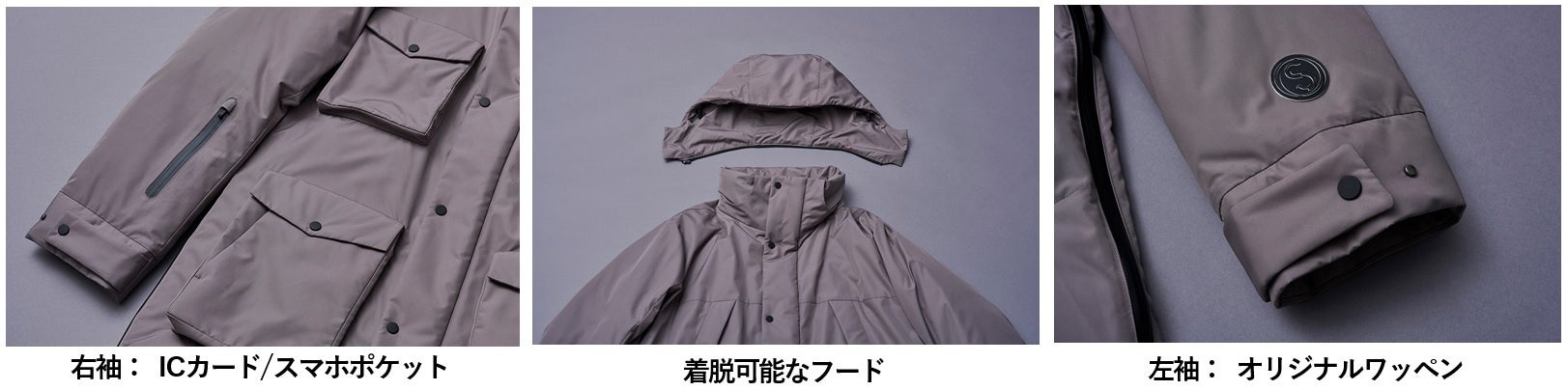ICカードやスマートフォンを入れる袖のポケットや、ベンチレーション(通気)とスリットを兼ねたサイドファスナー、着脱式のフードを装備し、突然の雨や気候の変化、電車での移動、ICカードやスマートフォンでのキャッシュレス決済など、都市生活を快適に過ごすための機能を備えたダウンコレクションとしてご提案いたします。