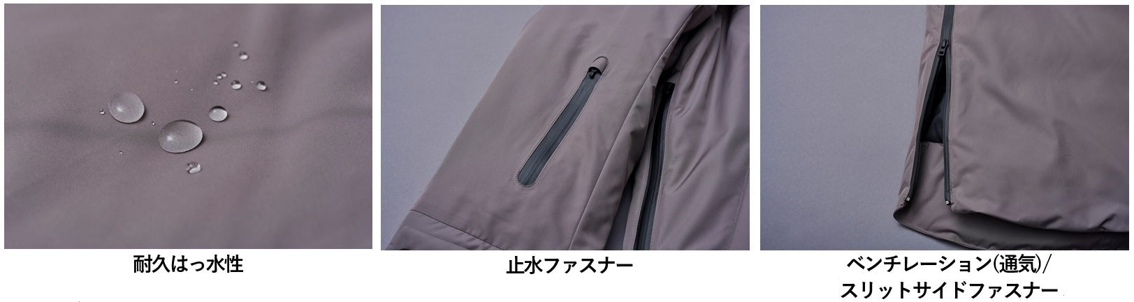 表地には高密度タフタ素材に耐久はっ水加工を施した日本製のオリジナルファブリック、裏地は抗菌性をもつ生地を使用することで、防臭機能も備えています。デザインの一部にもなっている止水ファスナーや縫製の仕様によりシェルダウンとしての機能を高め、カラーはシックなブラックとやわらかな色合いのグレージュの2色展開。スポーティーになりすぎず、街での着用にフィットするダウンコートです。
