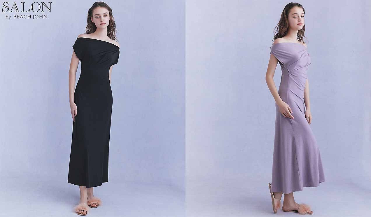 新作のルームウエアは3通りのルックが楽しめる。エレガントなカットソーワンピで優雅な自由時間。左肩と右脇に入れたタックの効果で生まれる、斜めの立体的なドレープがエレガント。そのままでフレンチスリーブの「ドレープネック」、片方の肩を見せる「ワンショルダー」、両肩を見せる「オフショルダー」と3つのデザインが楽しめるルームワンピです。伸びが良く落ち感のある薄手のカットソー生地でリラクシングな着心地。