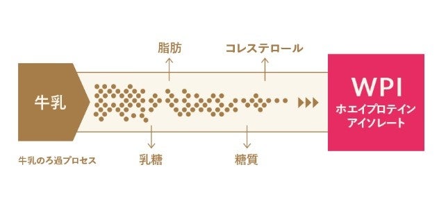 チーズを製造する際にできる上澄みの液のホエイはタンパク質を多く含んでいます。そこから水分を取り除き、タンパク質を濃縮したものが濃縮ホエイタンパク、いわゆるWPC(ホエイプロテインコンセントレート)といわれ、牛乳にわずかしか含まれていません。さらに不純物を除去し、タンパク質含有量が90%以上という高純度のプロテインがWPI(ホエイプロテインアイソレート)です。独自のフィルターを用いることで、高タンパク質、低糖質、低脂質を実現しています。WPIは水に溶けやすく、アミノ酸のBCAAも豊富で、スポーツやトレーニングでタンパク質を効率的に摂りたい方にはもちろん、ダイエットでカロリーが気になる方や、乳製品などで乳糖が気になる方にも安心してご利用いただけます。
