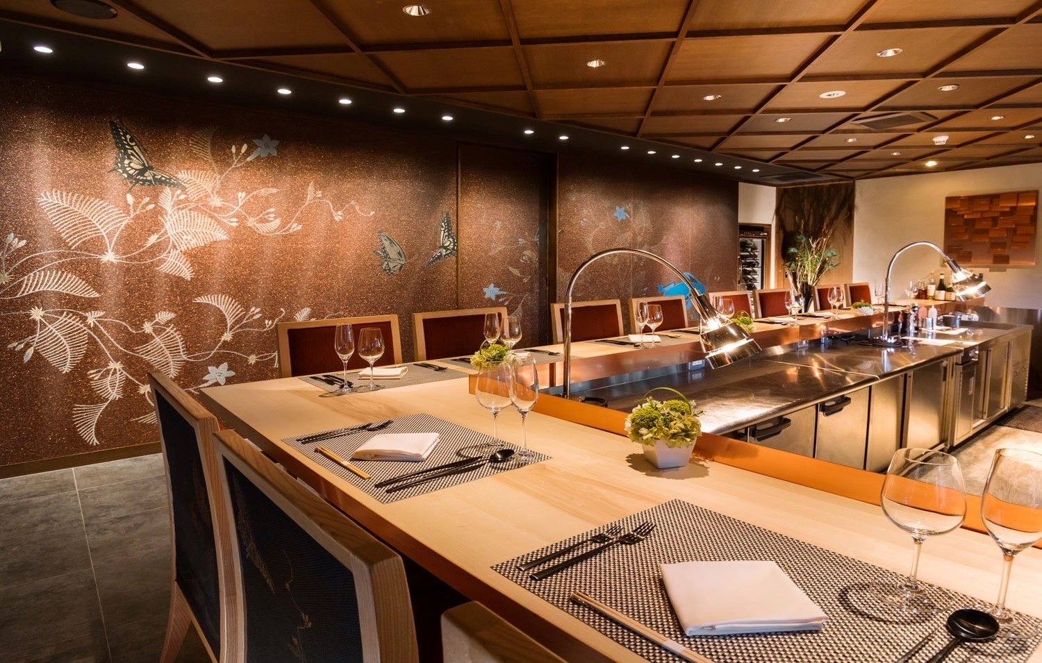 京都の着物デザイナーでありアーティストのJotaro Saitoによる西陣織が壁面や椅子の背面に施され、ラグジュアリーな空間を演出します。