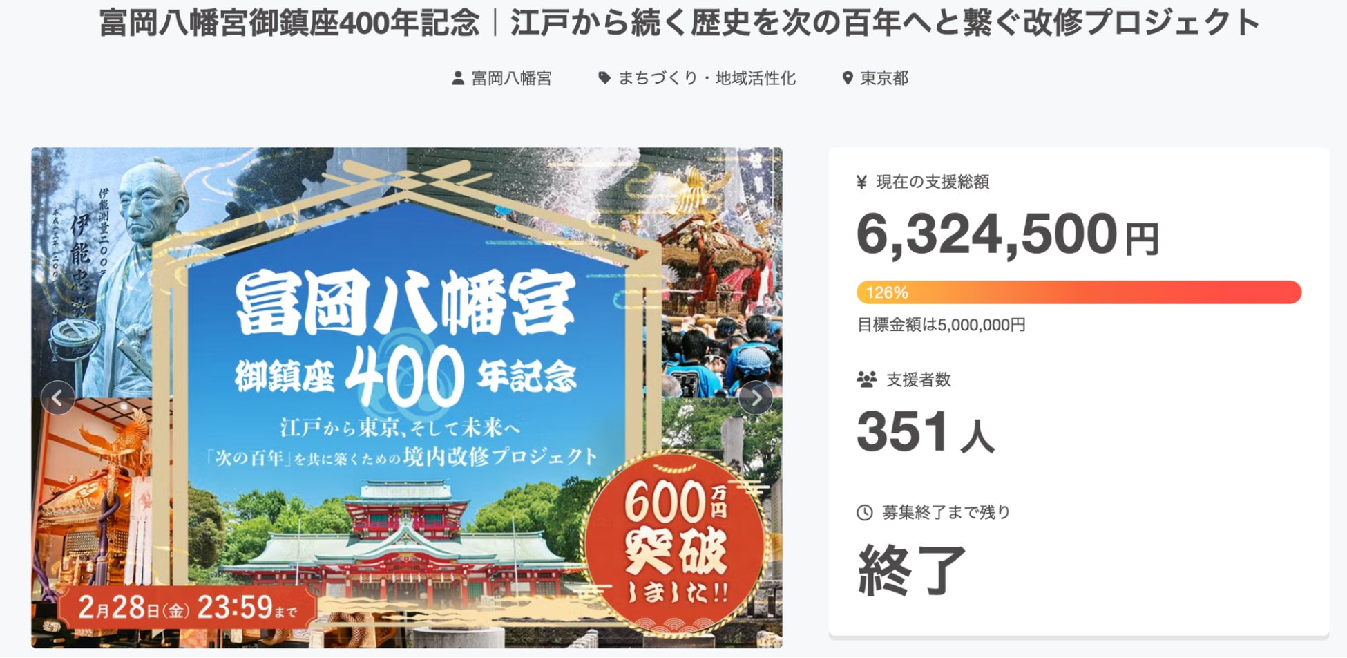 1. 富岡八幡宮 御本社御造営替 プロジェクト(支援総額632万円、351名が支援)