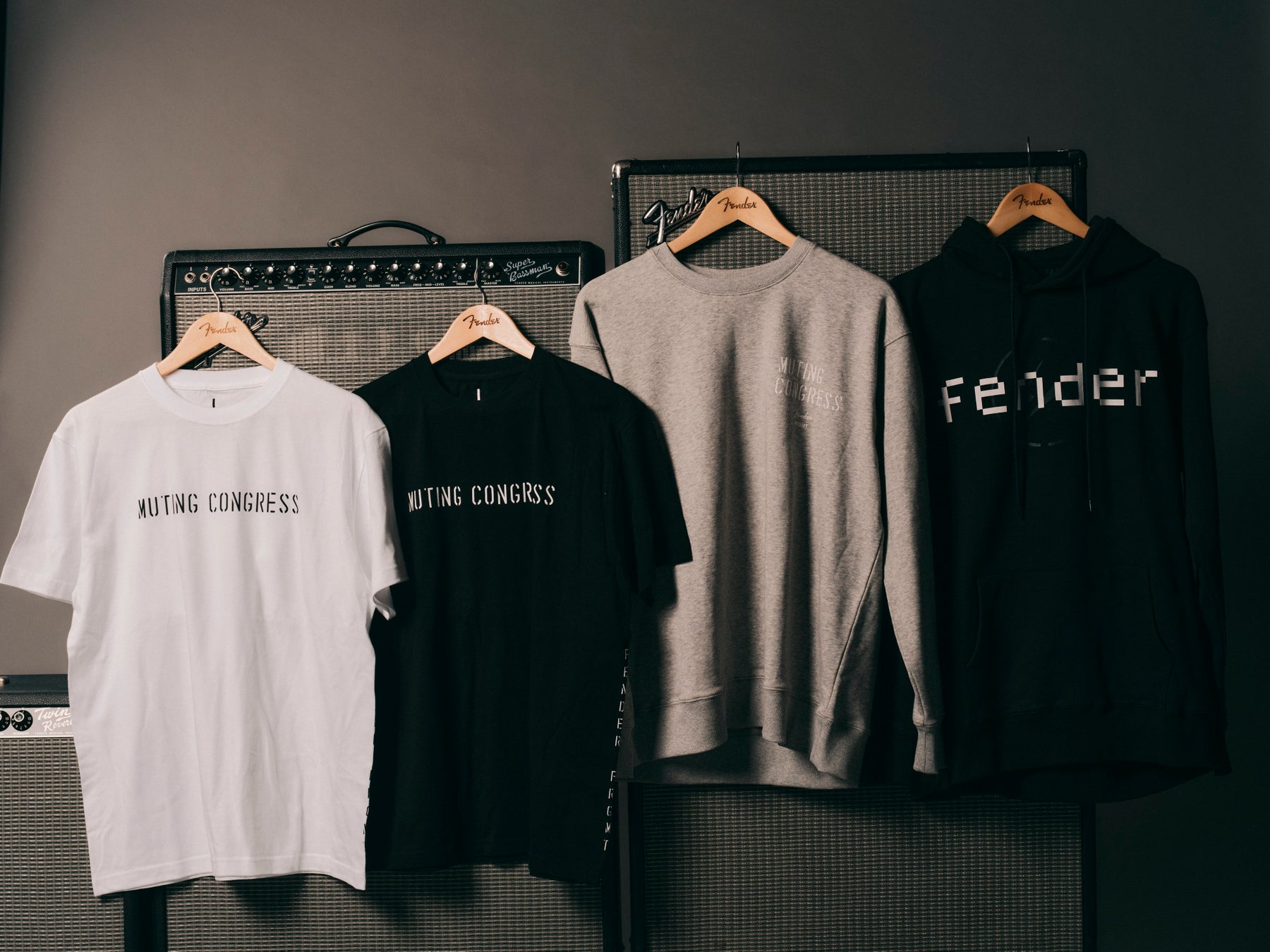 今回のコラボレーションを象徴するTシャツ、スウェットシャツ、フーディには、“MUTING CONGRESS”の文字がプリントされています。この言葉は、カッティング奏法を好む藤原ヒロシ氏が選んだもので、「テレキャスターといえばカッティング、そしてカッティングにはMUTING(ミュート)が欠かせない」という考えから生まれました。このフレーズには、「カッティングを奏でるギタリストたち」という意味が込められています。