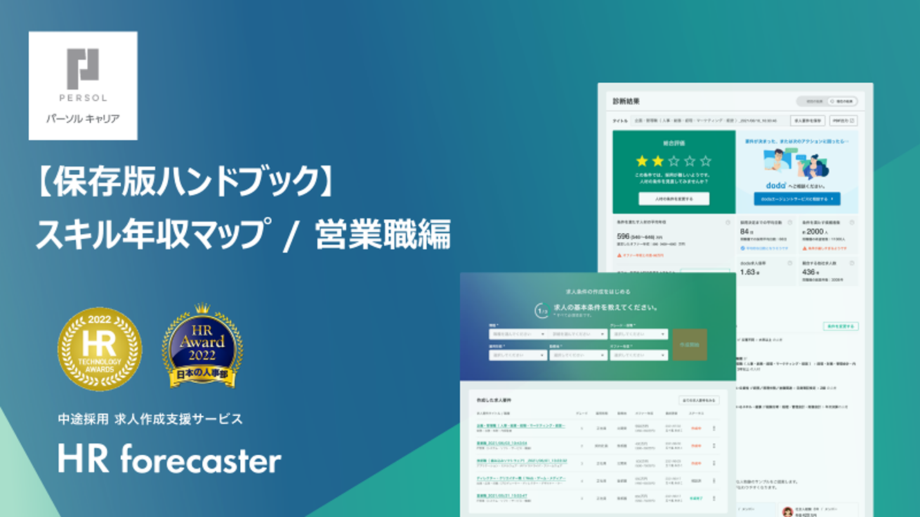 転職サービス「doda」を提供するパーソルキャリア株式会社が運営する100万件の転職統計データを活用した求人要支援サービス「HR forecaster(エイチアール フォーキャスター)」は、職種×スキルの平均年収がわかるデータ「保存版ハンドブック スキル年収マップ」の第3弾として、「営業職編」を2022年8月31日(水)に公開しました。今後は、「機械・電気・電子の技術職」、「接客・販売・サービス職」などのスキル年収マップを順次公開する予定です。