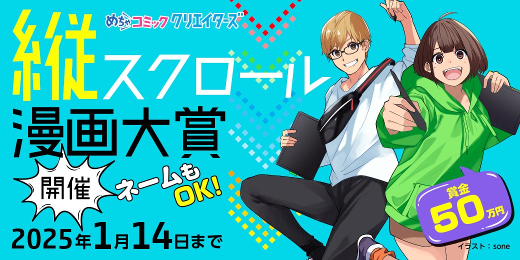 株式会社アムタス(東京都港区 代表取締役社長 児玉隆志)が提供する漫画投稿サイト「めちゃコミック クリエイターズ(めちゃクリ)」は、2024年11月15日(金)より「めちゃコミック クリエイターズ 縦スクロール漫画大賞」を開催いたします。受賞者には賞金最大50万円を贈呈いたします。