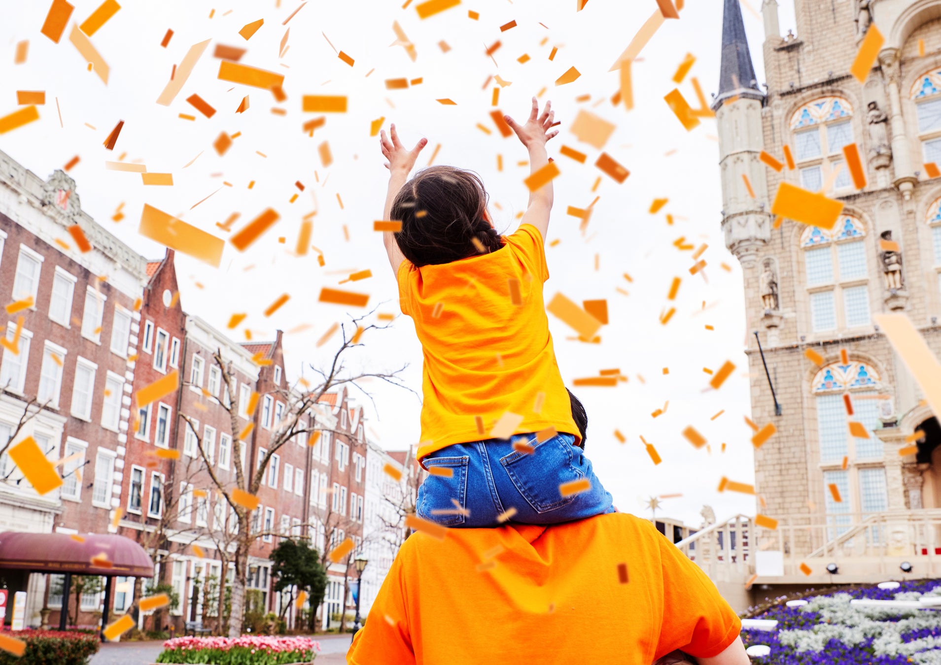 青空の下、オランダの街並みの中で一斉に降り注ぐオレンジ色の紙吹雪に思わず手を伸ばし掴みたくなるような高揚感は特別な体験となる事間違いなしです。