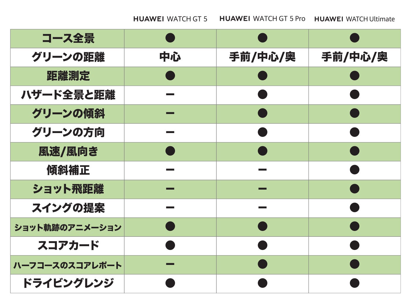 『HUAWEI WATCH Ultimate』は、同時発売の『HUAWEI WATCH GT 5』や『HUAWEI WATCH GT 5 Pro』と比べても、最上位のゴルフ機能搭載となっています。