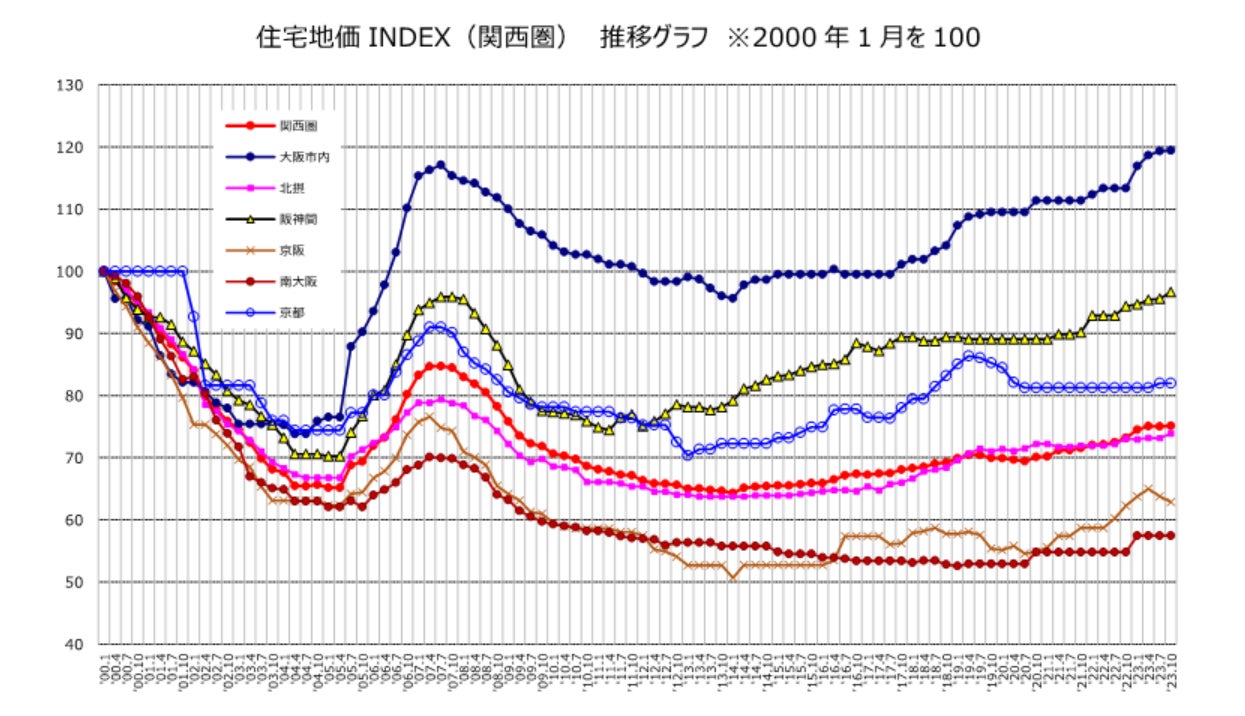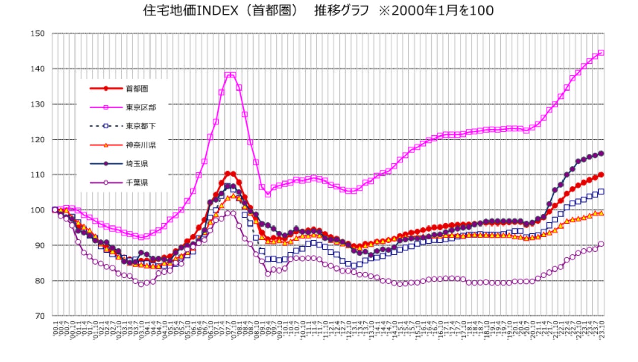 は、2023年10月1日時点の「住宅地価INDEX(https://www.nomu.com/knowledge/chika/)」の