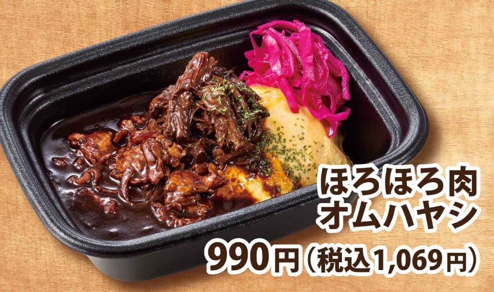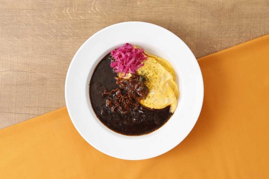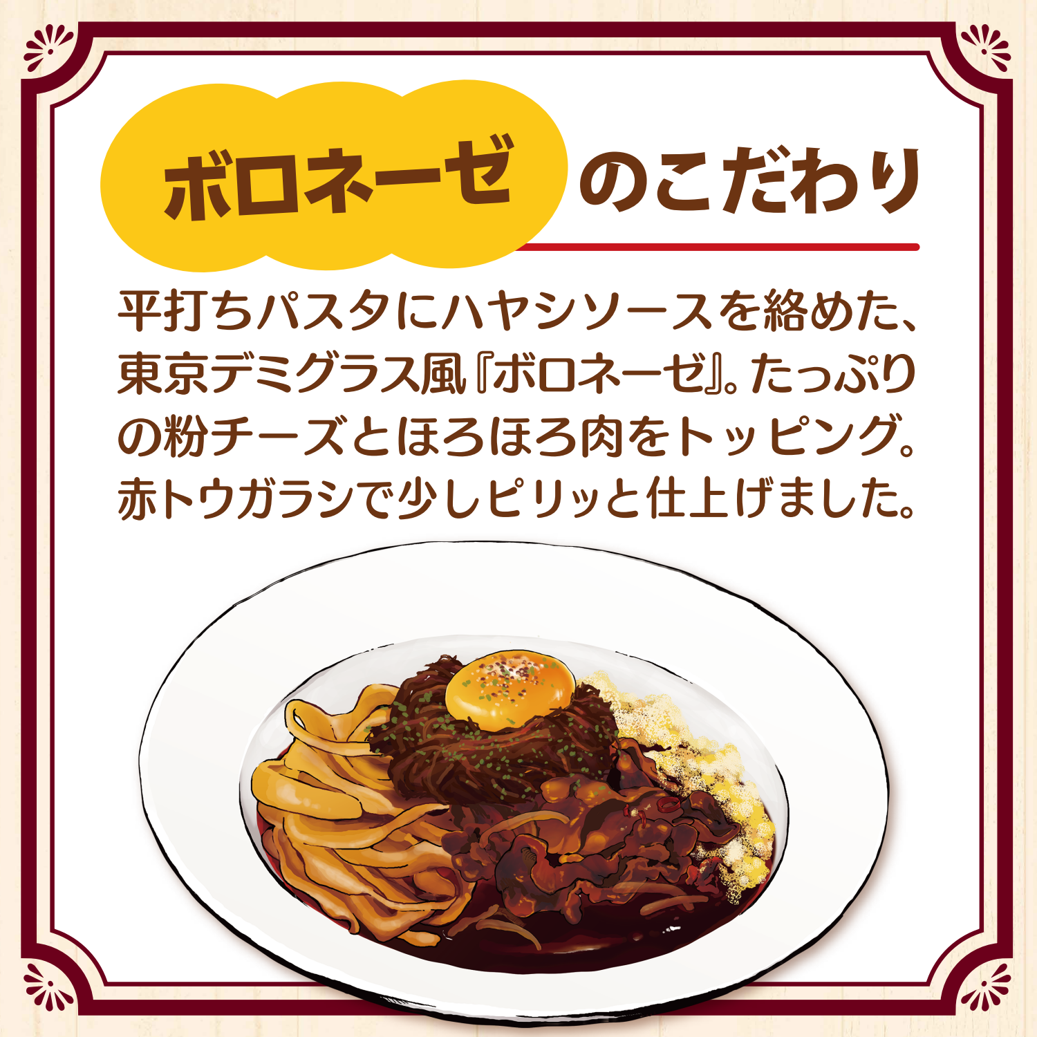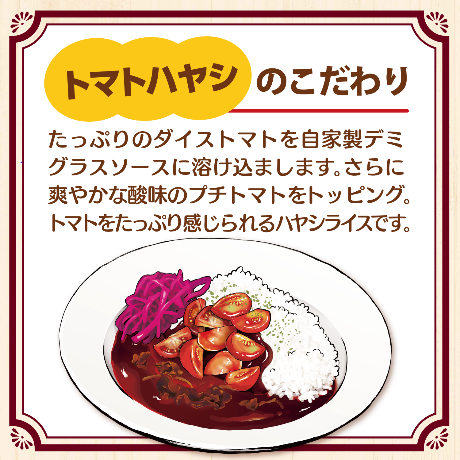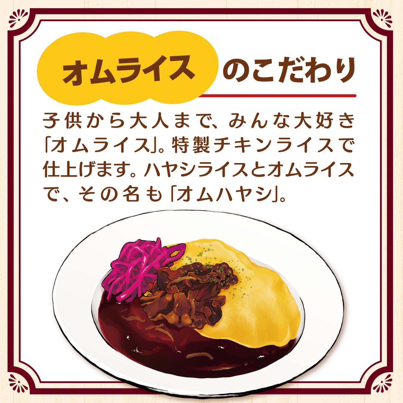 2021年12月27日(月)より販売するメニューは、トマトやほろほろ肉のトッピングでその時の気分によって楽しめる名物のハヤシライスとチキンライスのオムライス、そしてハヤシソースのボロネーゼをご用意しております。