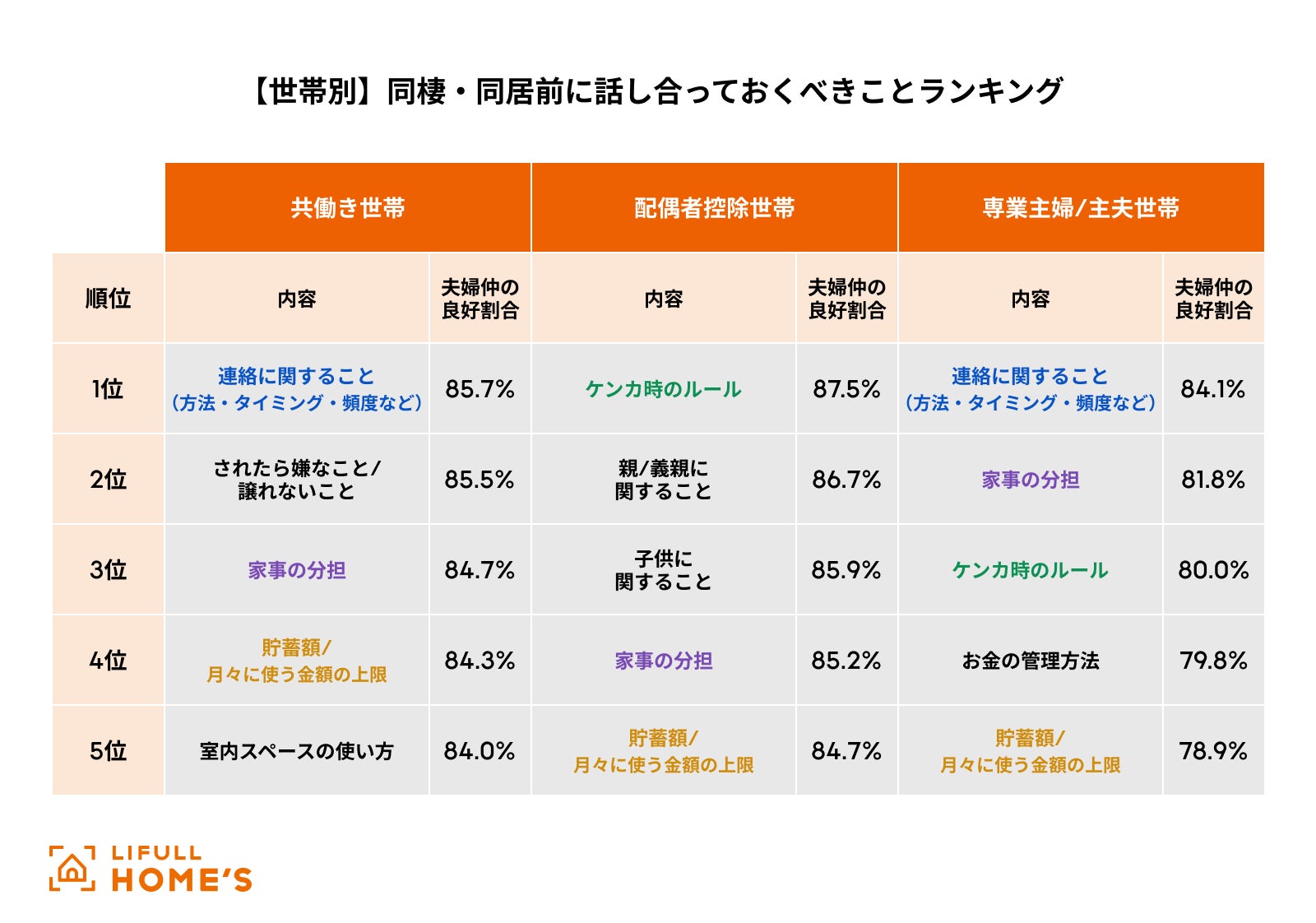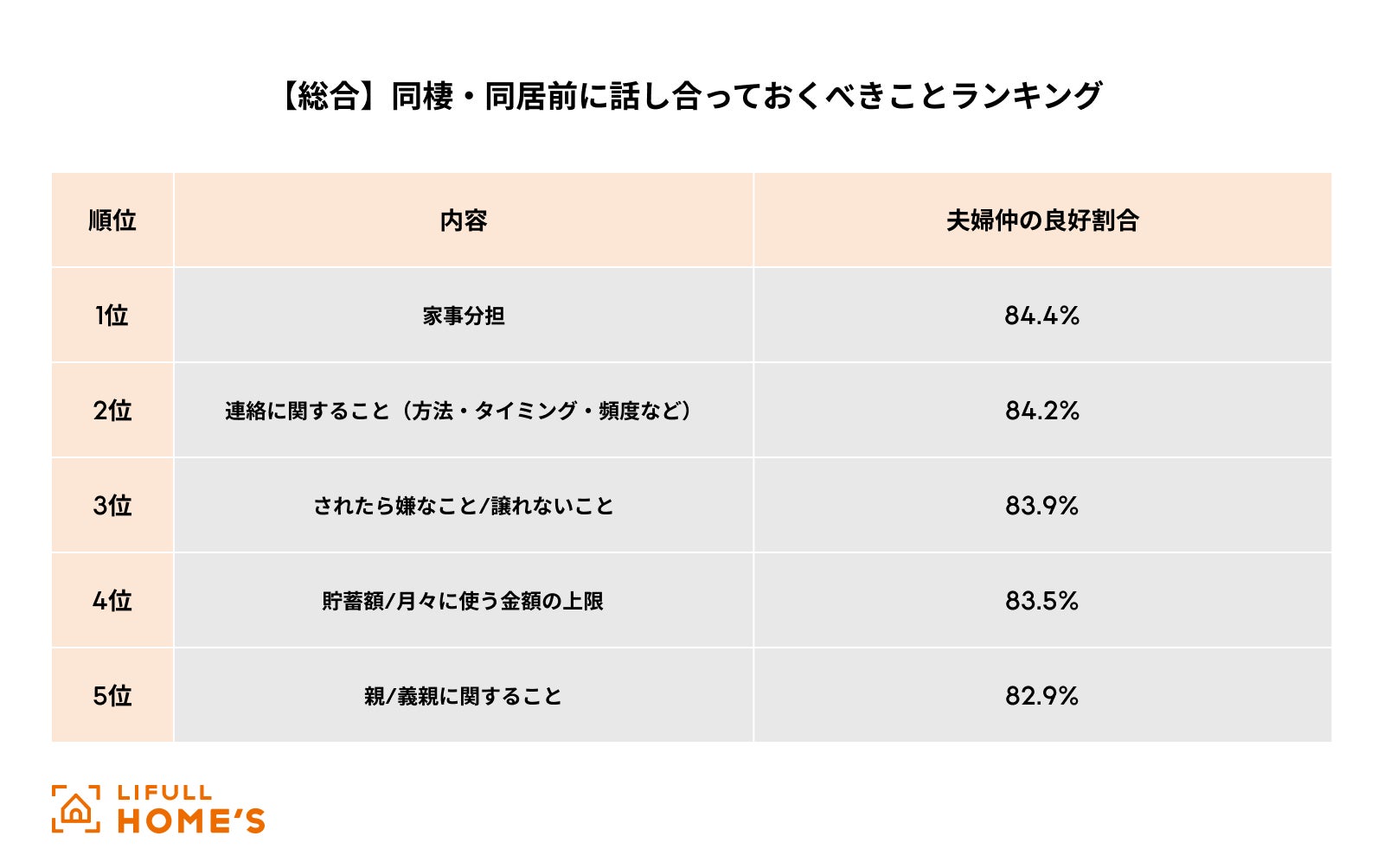 既婚者に聞いた「同棲・同居前に話し合っておくべきこと」ランキングをLIFULL HOME'Sが発表