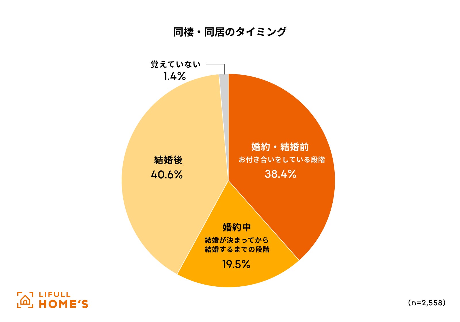 現在のパートナー(夫/妻)と一緒に住んだタイミングについて聞いたところ、最も多かったのは「結婚後」(40.6%)でしたが、「婚約・結婚前」(38.4%)、「婚約中」(19.5%)と「結婚前から」一緒に住む方が多数派でした。