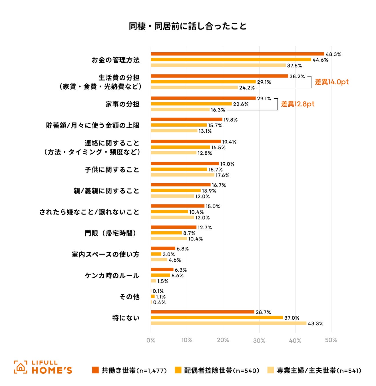 【同棲・同居前に話し合ったこと】最も多いのは「お金の管理方法」、共働きと専業主婦/主夫世帯間でギャップがあったのは「生活費の分担」と「家事の分担」