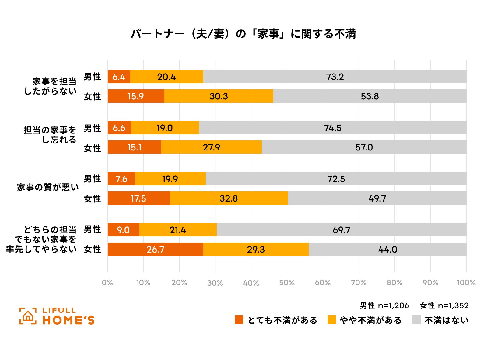 【パートナーの「家事」に対する不満】女性の方が不満大きく。中でも「どちらの担当でもない家事を率先してやらない」は男女間で大きな差