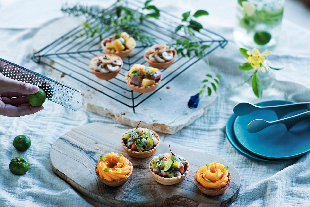 朝食のセットは、前日に客室へ届けます。予めカットした10種類のフルーツは、フレッシュな味わいをそのまま楽しんだり、ヨーグルトとあわせたり、目覚めの気分でアレンジできます。その他にも、フルーツにスパイスやハーブをあわせたサラダやアンティパスト、オーブンで自ら焼き上げるフルーツを盛り込んだ「セイボリータルト」も用意しました。甘くて爽やかなフルーツの香りとタルトの焼きあがるバターの香り、出来立てだからこその贅沢な香りと味わいが楽しめます。
