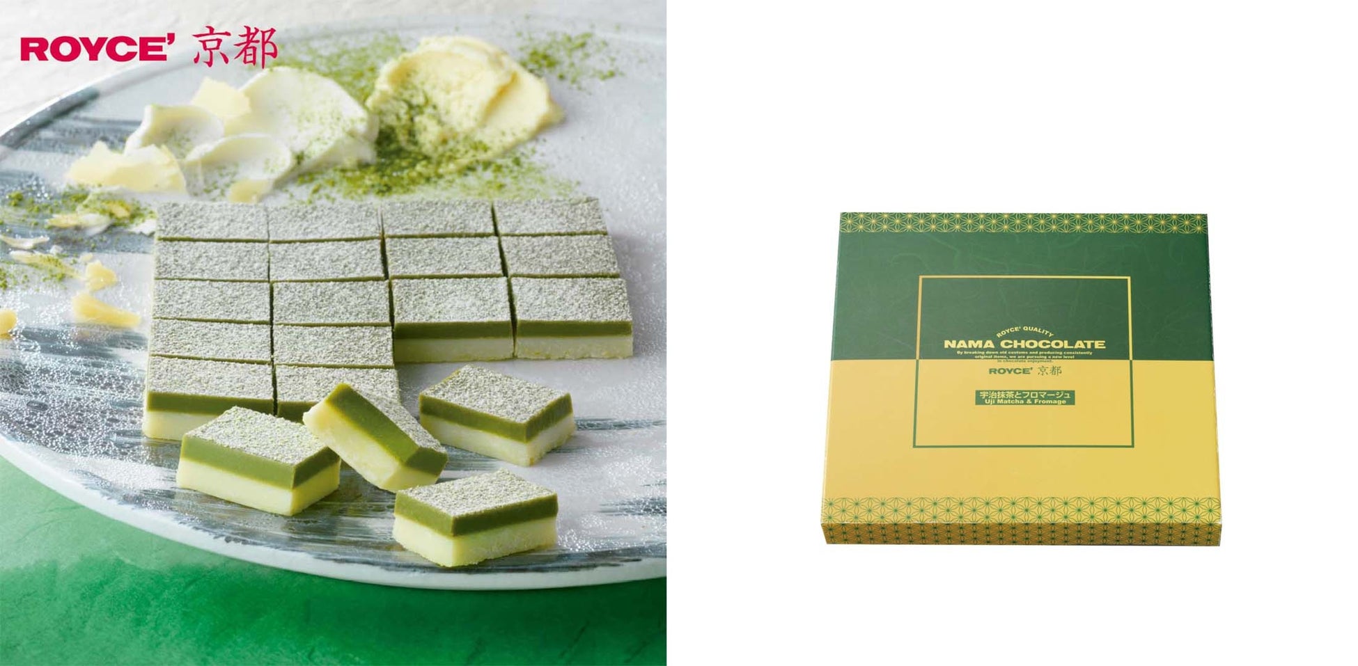 京都府産宇治抹茶をブレンドしたホワイトチョコレートと、北海道産の3種のチーズを使用したホワイトチョコレートを2層に重ねました。