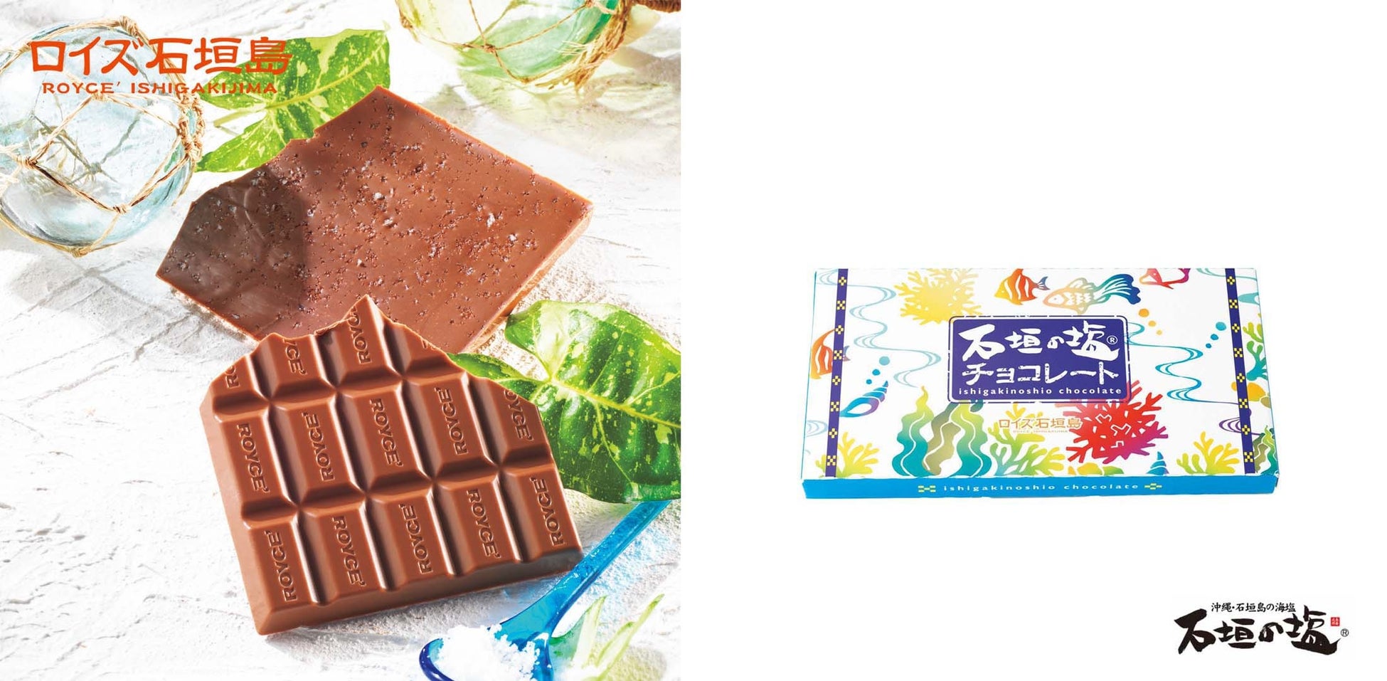 珊瑚礁が広がる石垣島の海水を原料とし、石垣の太陽でゆっくりと乾燥させて作り上げた「石垣の塩」(天日干し)。その希少な「石垣の塩」をミルクの風味豊かな板チョコレートの底面に散りばめました。旨みのあるまろやかな塩味がぱっと広がり、チョコレートの甘さとゆっくりとけ合います。