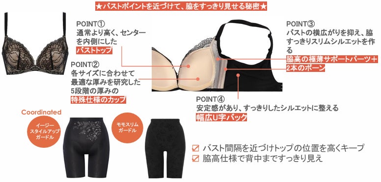 ヒミツは脇を大胆にカットした、着やせ仕様の特殊カップ。バスト間隔を近づけバストトップの位置を高くキープし理想的なボディバランスに。すっきりとした着やせシルエットをメイクします。