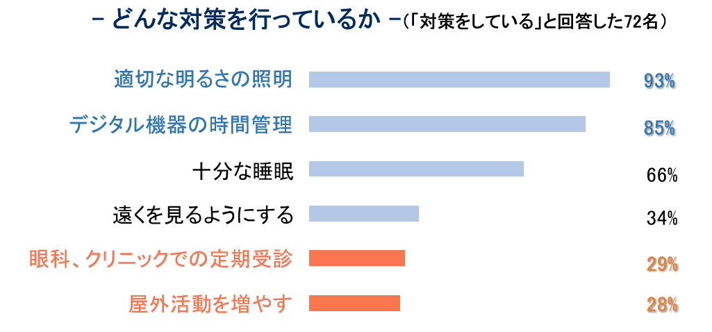 加えて、実際に行われている対策は「照明環境の調整」や「デジタル機器使用時間の管理」が中心であり、より効果的とされる「屋外活動の促進」や「眼科での定期受診」は3割未満にとどまりました。
