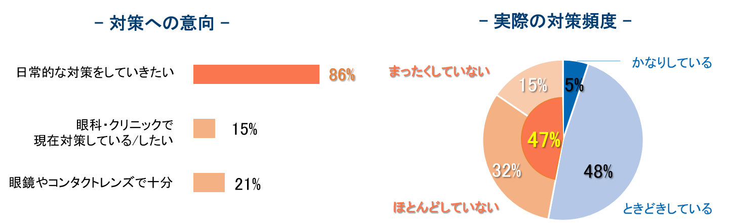 一方で、近視対策については8割以上が「日常的に対策を講じたい」と回答した一方で、実際に「対策を行っている」と回答したのは約半分にとどまり、意識と行動の間に差がある実態が明らかになりました。