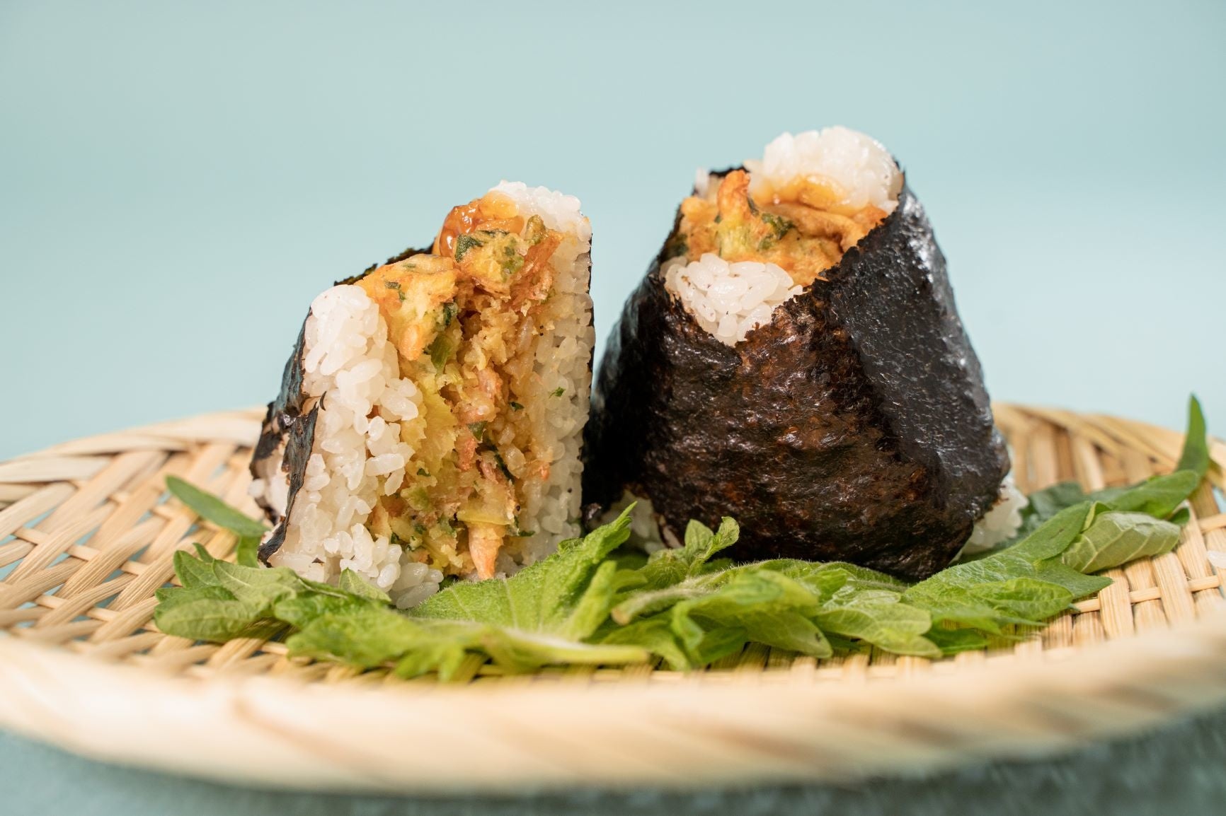 【内容】小えび、葉大根、たまねぎのかき揚げをごはんで包んだおむすびです。かき揚げには魚介風味の特製タレを合わせました。ボリュームたっぷりの具材がお楽しみいただけます。