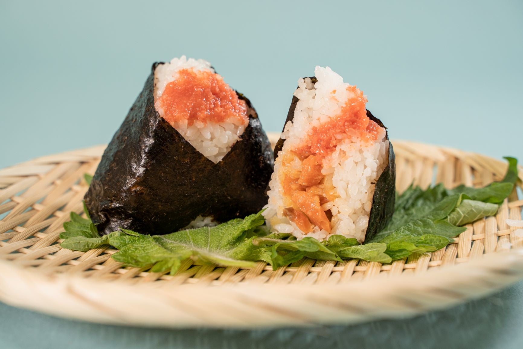 【内容】明太子と漬けサーモンを包んだおむすびです。おむすび上部には、明太子を包み、一口目から具材をお楽しみいただけるよう仕立てました。さらに、ごはんの中には、醤油ベースのタレに漬け込んで味をしっかりしみ込ませた漬けサーモンを包んでいます。