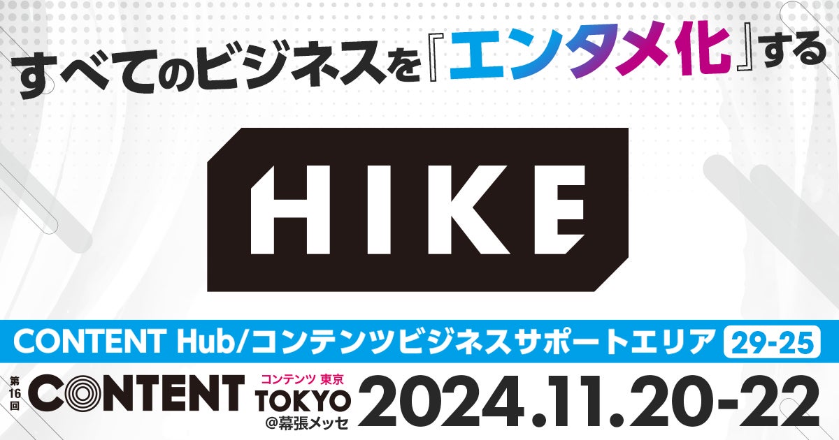 株式会社HIKEは、2024年11月20日(水)〜11月22日(金)に幕張メッセにて開催されるコンテンツビジネス総合展「コンテンツ東京2024」に出展いたします。HIKEは新設された「CONTENT Hub/コンテンツビジネスサポートエリア」に出展し、長年コンテンツビジネスをサポートしてきた当社の事例をご紹介します。