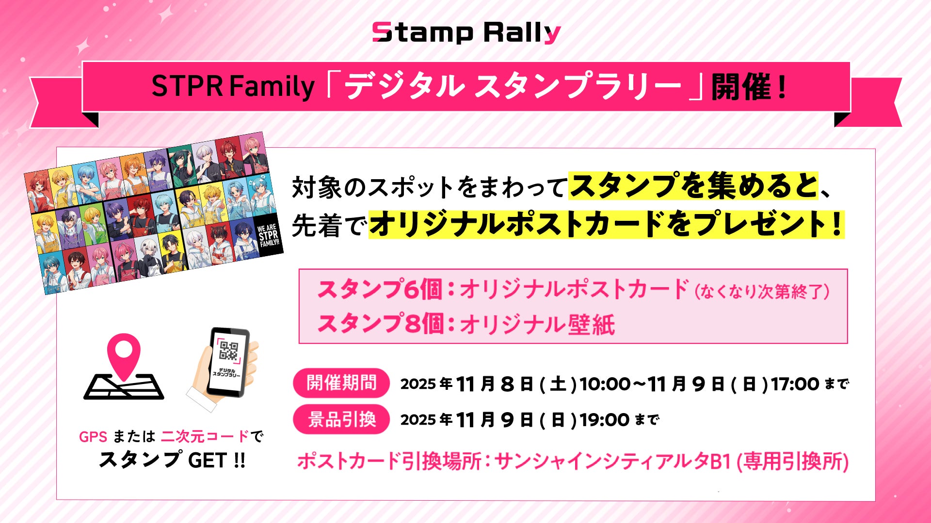 ただいま、STPRでは、AGF2025への初出展に合わせ、池袋エリアのいたるところで“観て・歩いて・食べて・集めて楽しめる”池袋ジャック企画を開催中。サンシャインシティアルタやサンシャイン通り商店街、アニメイト池袋本店、周辺店舗など20か所以上のスポットで、OOH掲出やデジタルスタンプラリー、店舗コラボなどを展開しています。また、サンシャインシティアルタでは「STPR POP UP STORE」やフォトスポットも実施され、池袋エリアのいたるところでSTPR Familyの世界観を体感することができます。