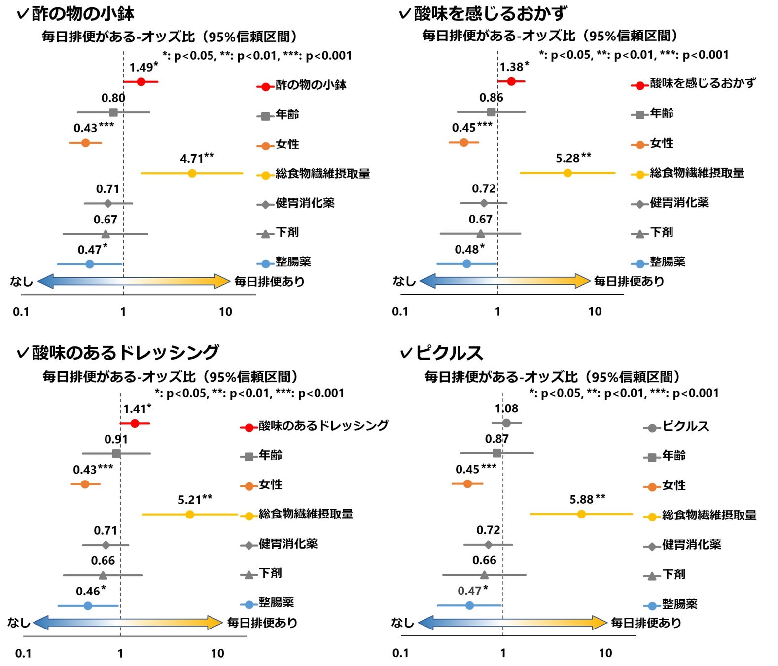 「排便状況(毎日排便があるか、排便に要する時間、いきみがあるか)」を目的変数とし、「食酢を用いた料理の摂食頻度(酢の物の小鉢、酸味を感じるおかず、酸味のあるドレッシングをかけたサラダ、ピクルス)」、「年齢」、「性別」、「薬の服用歴(健胃消化薬、下剤、整腸薬)」、「総食物繊維摂取量」を説明変数とする多変量ロジスティック回帰分析を行いました。