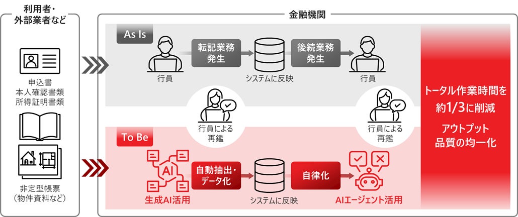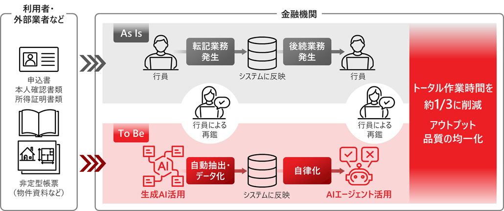 金融機関においては、DXによる業務効率化の一環として、顧客や外部業者など、行外から提出される書類を行内システムに行員が手入力する、転記業務が多く残っています。例えば、住宅ローン業務では、定型帳票については、AI-OCR*2などの活用でシステム入力の自動化が進む一方、物件資料や図面といったフォーマットの異なる非定型帳票は、依然として人手による転記・確認作業に依存しています。これらによる業務負荷の増大や、申込段階から審査回答までに時間を要することに加え、人手では細かい確認や問題点の発見が難しいことなどが課題となっています。