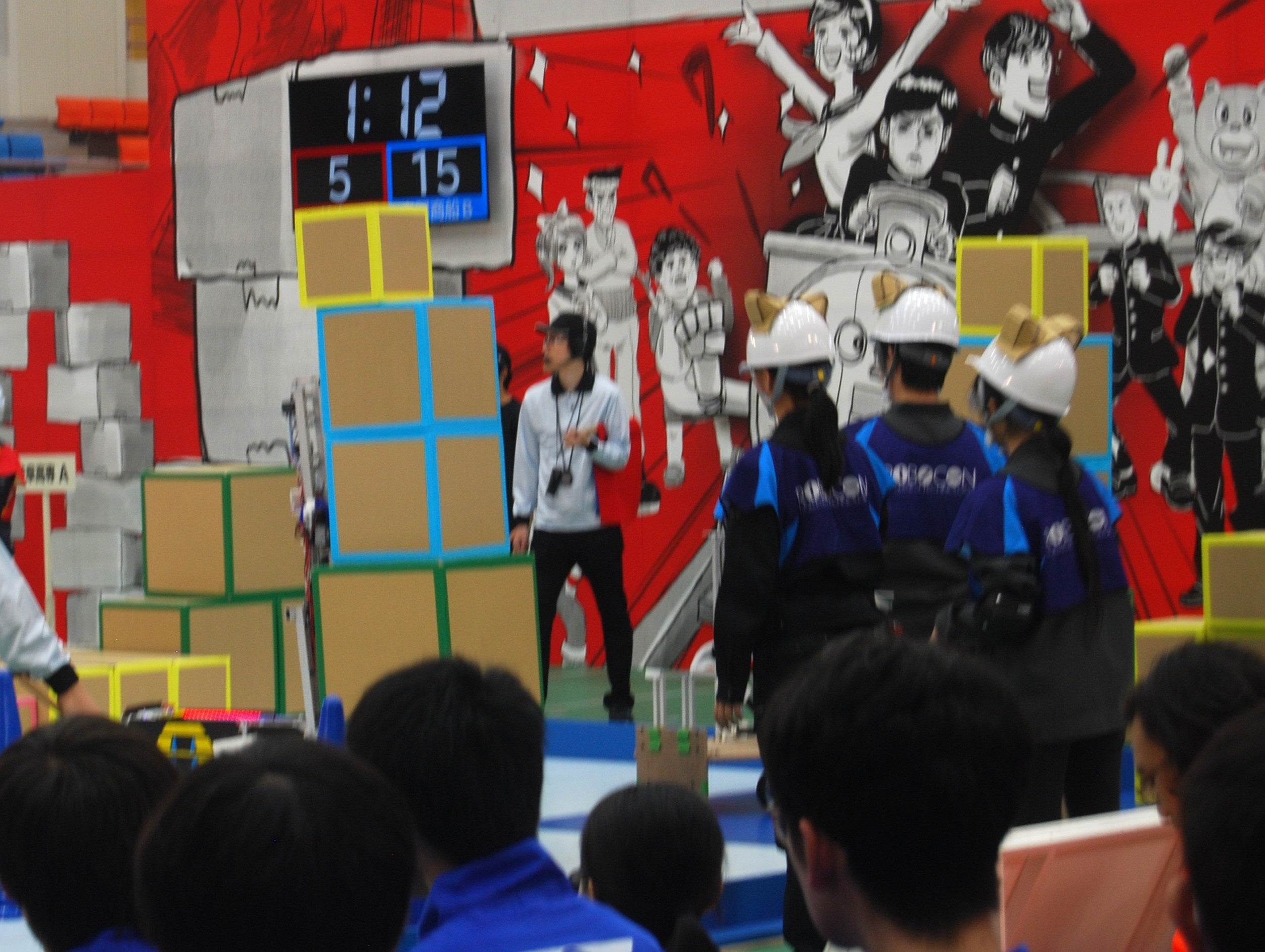今年度の競技テーマは「Great High Gate」。大小さまざまな段ボール箱を積み木のように組み上げてゲートを作り、ロボットと、そのロボットが牽く人を乗せた台車がくぐるという課題です。くぐった門の高さなどが得点となりますが、単に高く積むだけでなく、ロボットのコンパクトさや牽引力、箱を有利に確保するための機動力など、設計面・戦略面の両方で創意工夫が求められました。