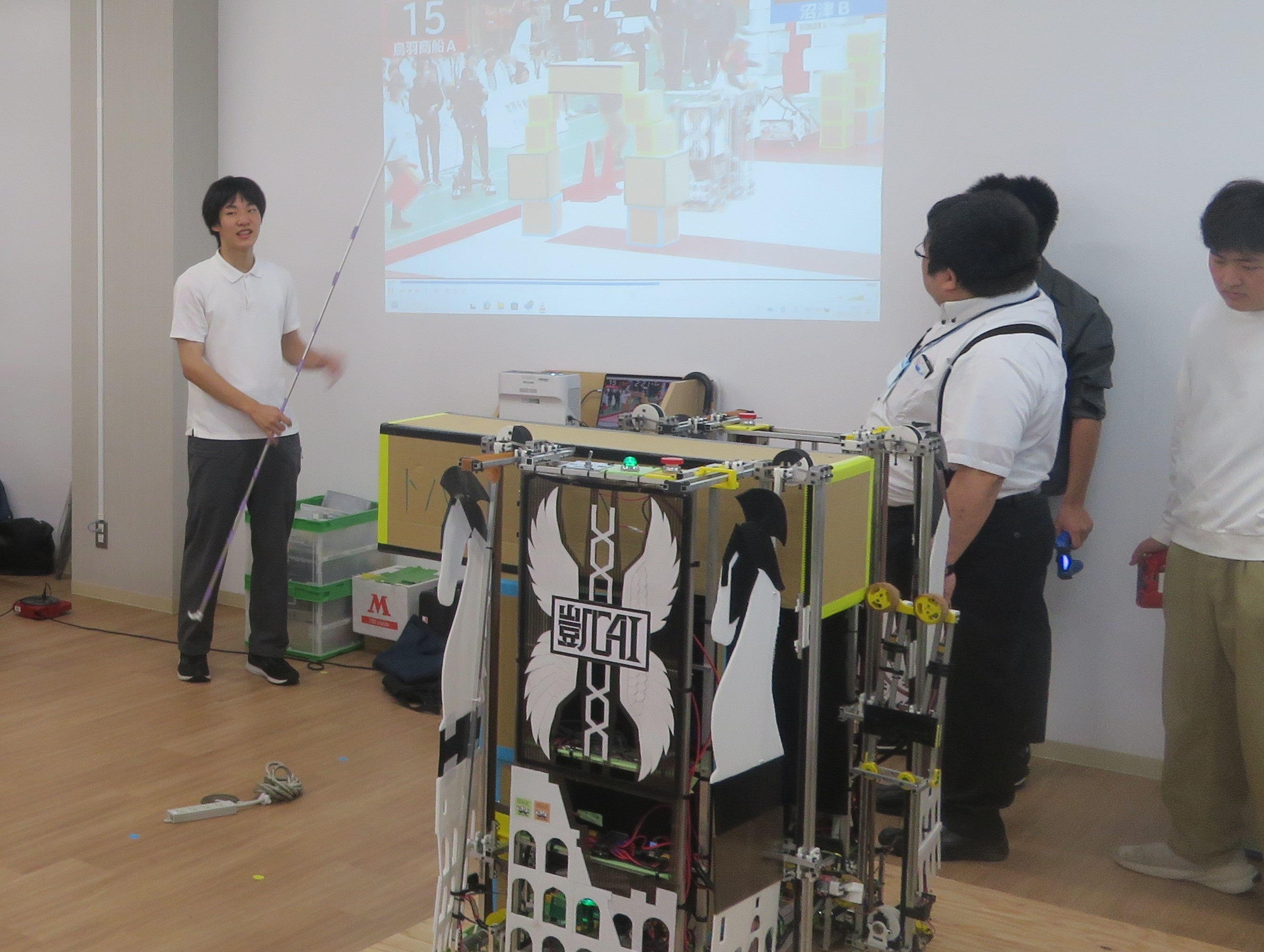 大会から1週間後、鳥羽商船高専で開催されたオープンキャンパスで、学生は今大会の高専ロボコンに出場したロボットをオープンキャンパス参加者に早速披露しました。箱を高く積み上げ、ダイナミックに動くロボットの姿に、来場者からは「ロボコンに興味が湧いた」との声が寄せられました。学生たちは大会後も、ものづくりの楽しさとロボコンの魅力を伝え続けています。