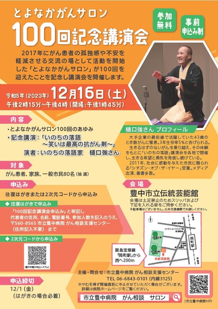 市立豊中病院は、がん患者の孤独感や不安を軽減させる交流の場として活動を開始した「とよなかがんサロン」が100回を迎えたことを記念し、講演会を開催します。講師には、がんを乗り越えた自身の体験をもとに「いのちの落語」講演会を全国各地で開催し、生きる希望と勇気を発信し続ける樋口強さんをお招きします。
