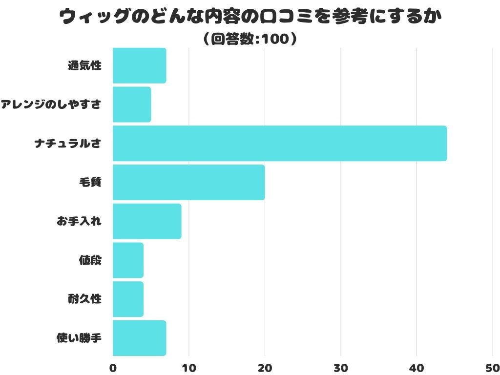 ウィッグのどんな内容の口コミを参考にするかをアンケートにて調査したところ、1位は「ナチュラルさ」でした。