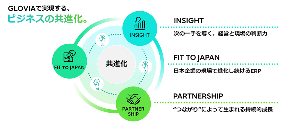 「GLOVIA One」は、3つのコンセプトINSIGHT(インサイト)、FIT TO JAPAN(フィットトゥージャパン)、PARTNERSHIP(パートナーシップ)を軸に、現場の変化と経営の高度化が循環し、様々な企業が起こすイノベーションを継続して取り込むことで進化が続く状態である“共進化”を実現していきます。