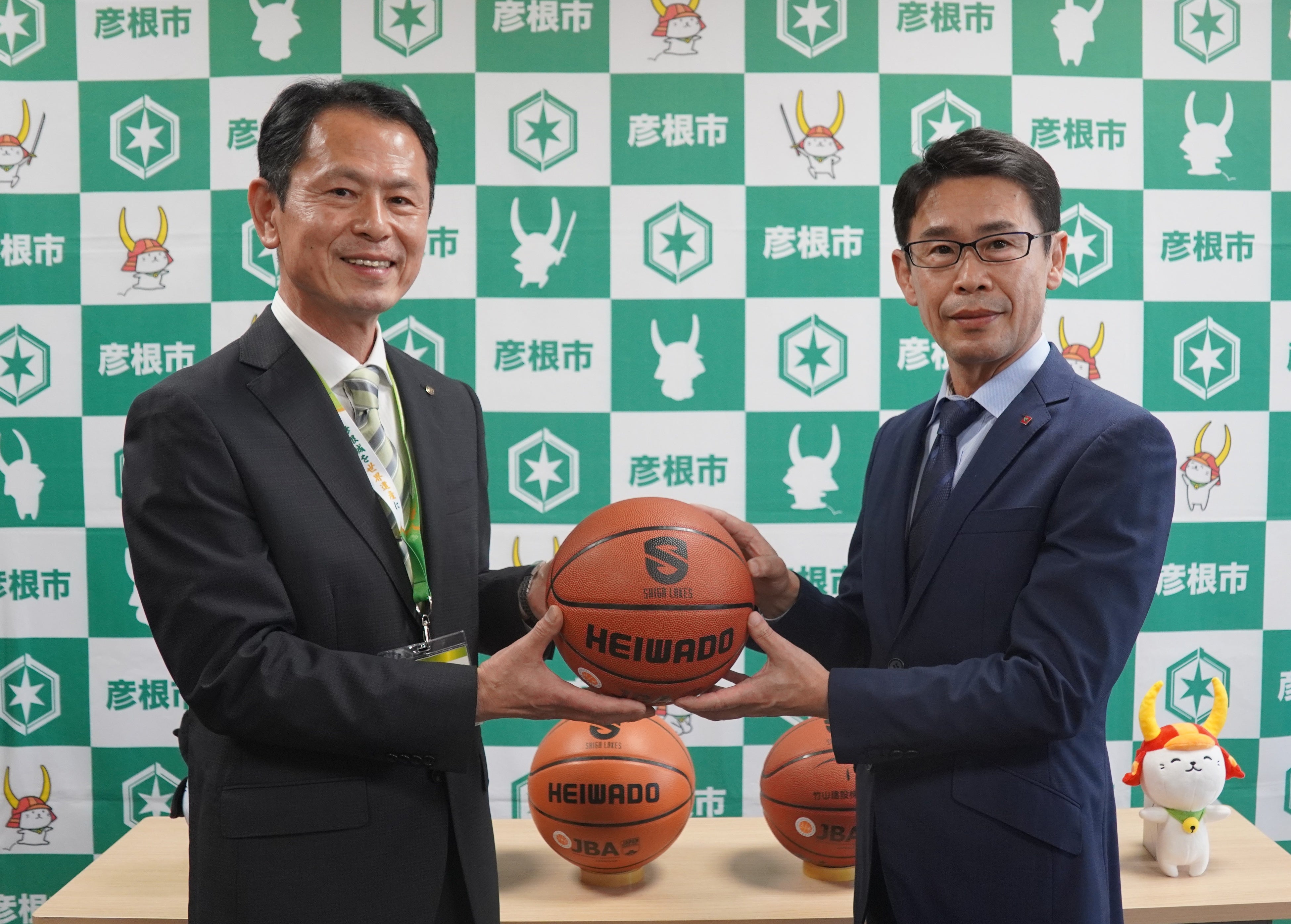 5回目となる今回、滋賀レイクスと平和堂のロゴが入ったバスケットボールを小学生向けサイズ、中学生向けサイズあわせて31球寄贈しました。お渡ししたバスケットボールは、彦根市教育委員会を通じて彦根市内の公立小・中学校へ届けられます。