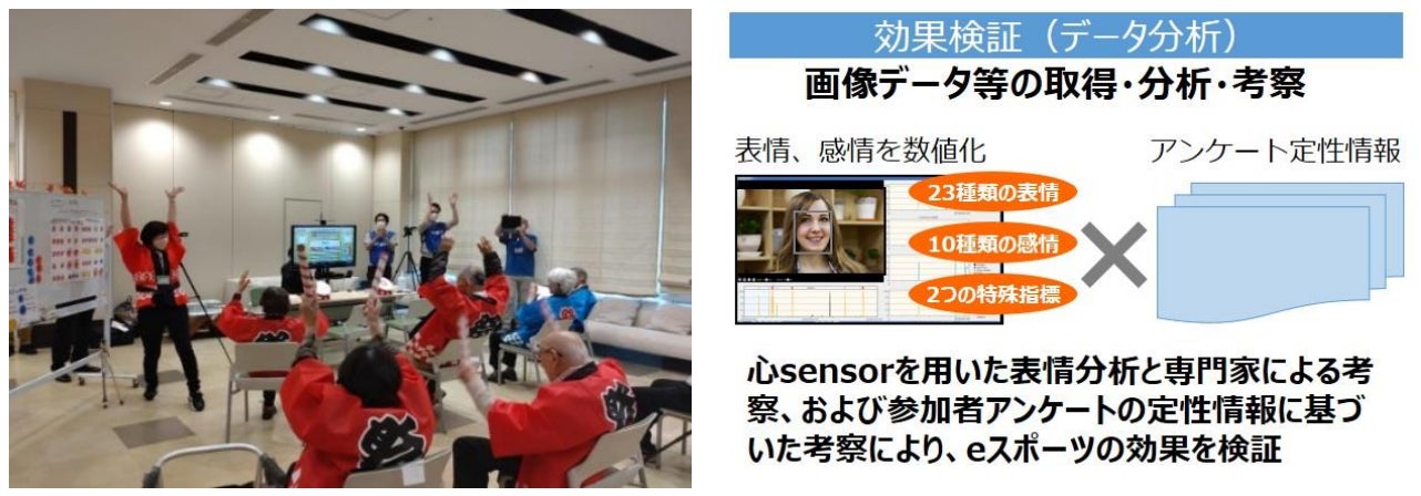 レクリエーション介護士が体験教室のインストラクターとなり、障がい者、高齢者が安全かつ分かりやすくeスポーツを体験できるようサポートを実施しました。体験教室に参加された方の様子を表情・感情認識ソフトウェアにより分析、ならびに専門の表情分析官の考察に基づき、eスポーツの効果を検証・分析しました。