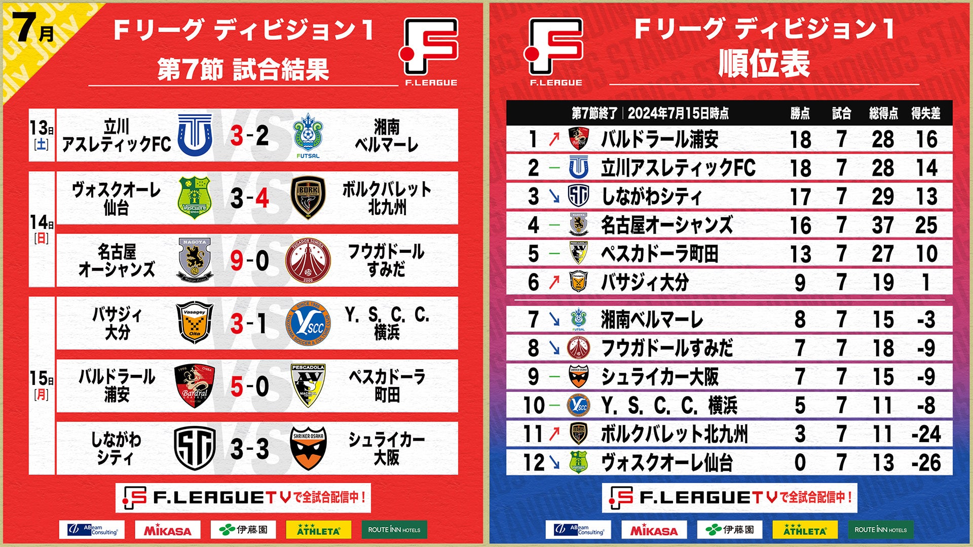 7月13日(土)〜15日(月・祝)の3日間で実施されたFリーグ2024-2025 ディビジョン1 第7節の6試合について結果をお知らせいたします。
