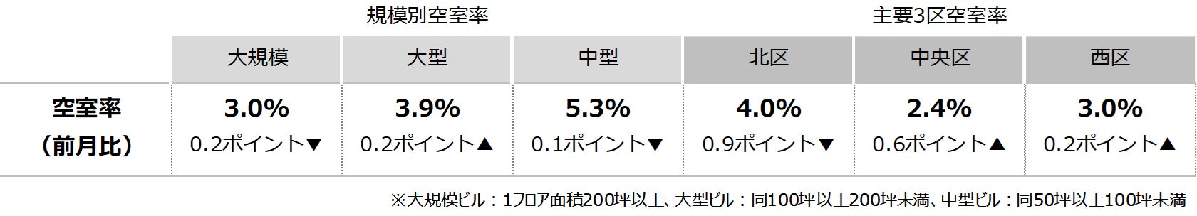 空室率は前月比マイナス0.20ポイントの2.98%と、4ヵ月連続で低下し2023年12月以来の2%台となった。前月に続き、新築・築浅ビルを中心に空室消化が進んだことが主な低下要因となっている。エリア別では「北区」が前月比マイナス0.9ポイントと大幅に低下した。潜在空室率は前月比マイナス0.10ポイントの4.77%となった。