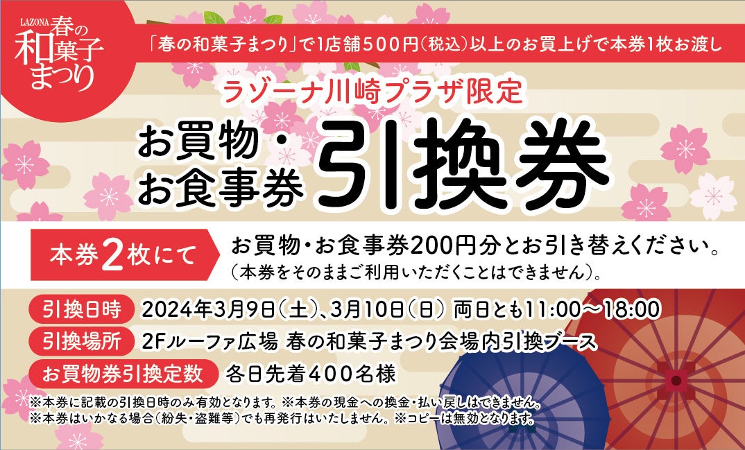 ルーファ広場の「春の和菓子まつり」で1店舗500円(税込)以上のお買上げで引換券を1枚お渡しいたします。2枚あつめると、ラゾーナ川崎プラザの各店舗で使える200円分のお買物・お食事券を各日先着400名様にプレゼントいたします。