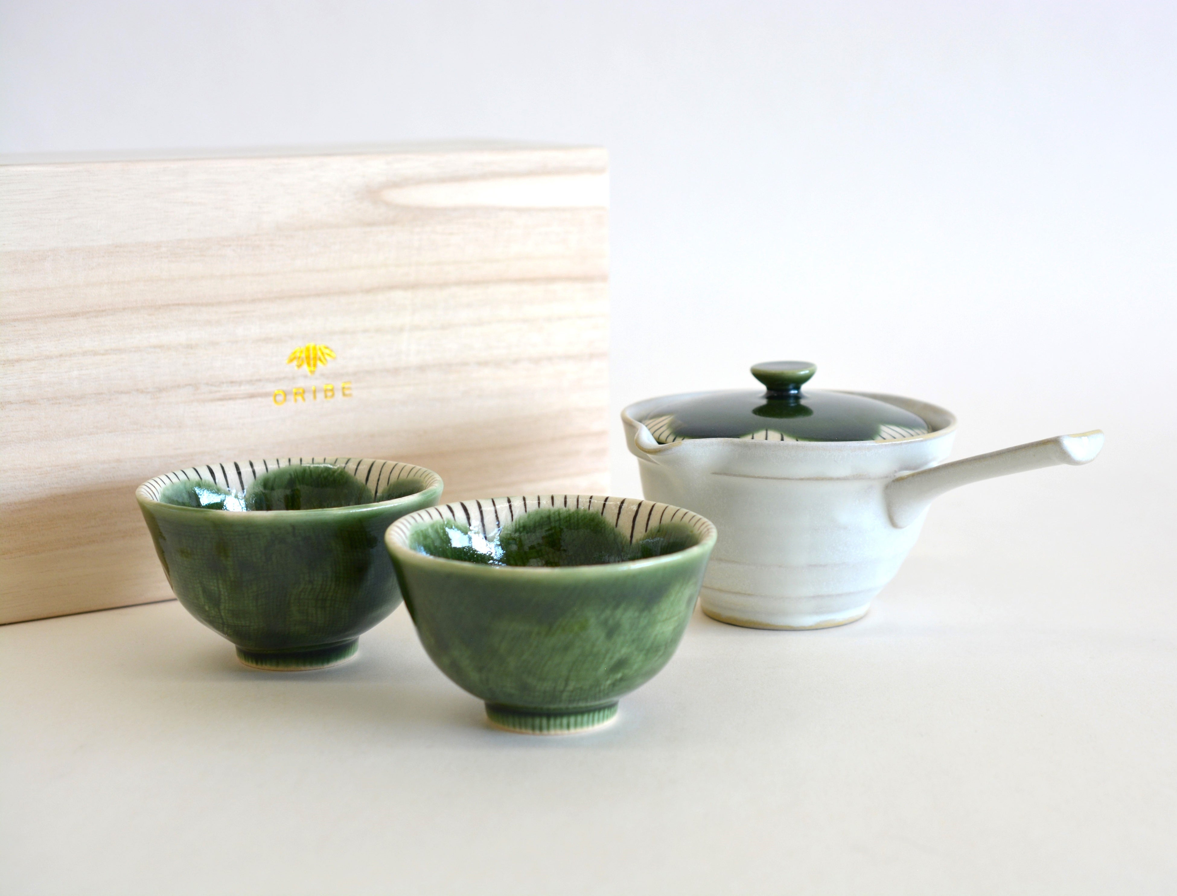 織部釉の緑が印象的な「花織部 茶器セット」。ほっと一息のティータイムや春のおもてなしにもぴったり。お茶の時間をオシャレに楽しく彩ります。